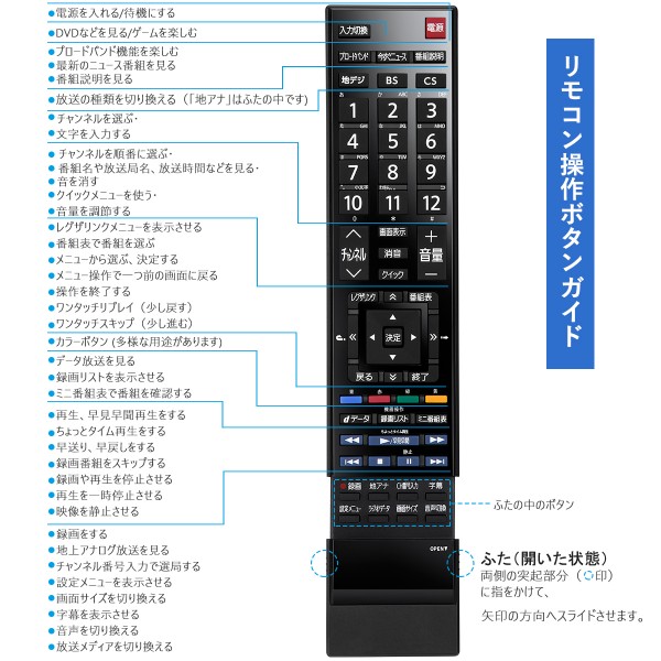 東芝テレビ用、“ユニバーサルデザイン”をコンセプトに進化したレグザリモコン。よく使用しない録画相関のボタンは”扉”で保護された。